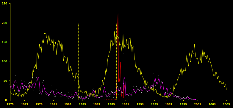 Ce résultat parait plus solide dans la mesure ou au moins 7 demi-périodes d'activité du soleil (sur 10) sont correctement associées avec des pics d'observation d'OVNI (8 si la vague de 1990 est considérée, voir l'exemple ci-après).