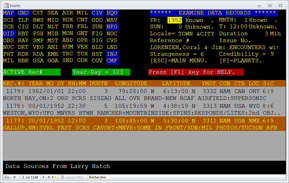 J'aurais pu utiliser les données recensées sur ce site, (gracieusement fournies par Luc Chastan et le NUFORC) , soit 4988 cas, mais celles-ci n'étaient pas encore suffisamment exhaustives. Aussi, l'analyse qui suit a été réalisée à partir de la base de données de Larry Hatch ("U-Database", 17774 cas) et tournant sous MS-DOS. Larry Hatch disposait d'un site web qui n'existe aujourd'hui malheureusement plus (car il y a environ trois ans de cela il a malheureusement eu un AVC).