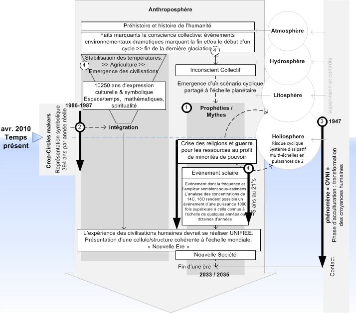 2- du fait du scénario des crops-circles makers qui nous rappelle combien l'émergence de nos civilisations n'a été rendue possible que grâce à une stabilisation des températures et donc ... aussi à la qualité du flux solaire. Ce lien Crop-Circle-Champs-Symboles retrace l'importance du lien qui existe entre la naissance de l'agriculture, l'essor du commerce puis des civilisations. Ce processus s'accompagnant d'un accroissement sans précédent de la richesse d'expression symbolique et culturelle. Quels que soient leurs créateurs, les crops-circles, paraissent tracer un scénario semblable à une forme d'expérience de mort imminente (EMI) à une échelle tout autre qui est celle des civilisations humaines: ils nous refont vivre de manière accélérée et métaphorique notre histoire symbolique et culturelle. Réalisés dans des champs de blé, ils nous parlent implicitement du contrôle environnemental et de notre propre conquête de l'espace et du temps et les constructions syntoniques (culture) qui en émerge. Par l'homme, avec la naissance de l'agriculture, au delà de l'homme, avec une stabilisation des températures sans précédent vis à vis des autres ages interglaciaires et tout au long de l'holocène : 11000 ans couverts par les Crops Circles, globalement, depuis le dernier "accident" climatique.