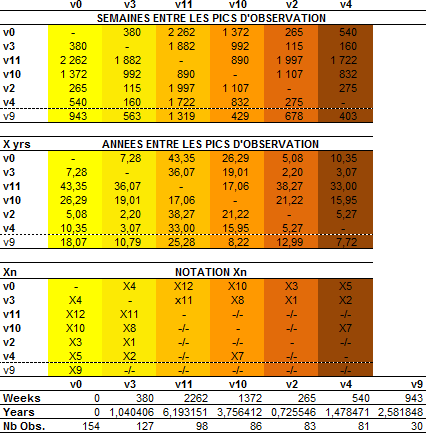 Ces périodes expriment toutes une relation avec la deuxième vague "v3" la plus forte après "v0", sauf X10 qui est probablement associée de manière malencontreuse. De façon plus générale, c'est un résultat qui peut s'appliquer à toutes les vagues pour calculer les périodes qui les lient moyennant un offset adéquat, le facteur exponentiel restera peu ou prou inchangé avec f(x)=b.ax et a ≈ e0,3573 ≈ 1,4294.