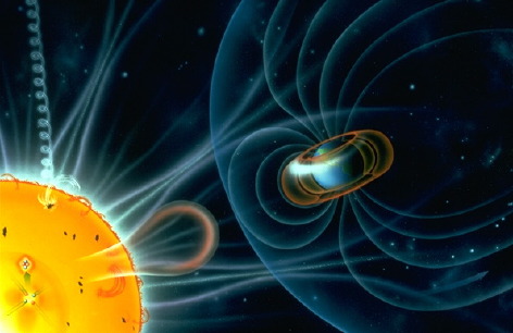 La tempête de radiations solaires désigne l'effet provoqué par les ions et électrons transporté par la matière coronale sur l'atmosphère terrestre. Ordinairement, le champ géomagnétique terrestre dévie la plupart de ce plasma. Toutefois une partie de celui-ci peut s'approcher des couches les plus denses de l'atmosphère en circulant le long des lignes de champ magnétique ce qui crée des aurores boréales. Généralement elles se forment au niveau des cercles polaires, là ou les lignes de champ magnétique se rapprochent du sol tout en conservant une intensité suffisante.