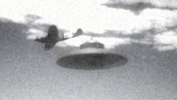 Soit-disante photographie d'un Haunebu I, en vol d'essai aux côtés d'un chasseur Messerschmidt BF109. Document non-sourcé et évidemment suspect.