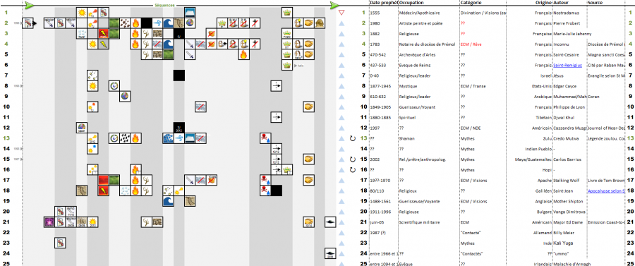 Chaque ligne du tableau présente une prophétie avec son origine culturelle, sa datation et son auteur lorsque ce dernier est connu. Les icônes symbolisent la séquence d'événements décrits par la prophétie. Les textes des prophéties utilisées sont fournis en bas de cette page. cliquer pour agrandir. |