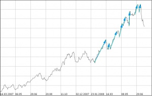 • La veille du discours de Bernanke, le 15/07/2008, le CAC 40 touche un plus bas depuis 3 ans (18/05/2005). Juste après, il s'ensuit 6 séances de hausse consécutive (+1.26%, +2.76%, +1.74%, 1.25%, 0.0%, 1.88%), soit de 4070 à 4408 points en 6 séances ! Le Dow Jones rebondit de 6% et les banques françaises s'apprécient de 18% sur la même période.
