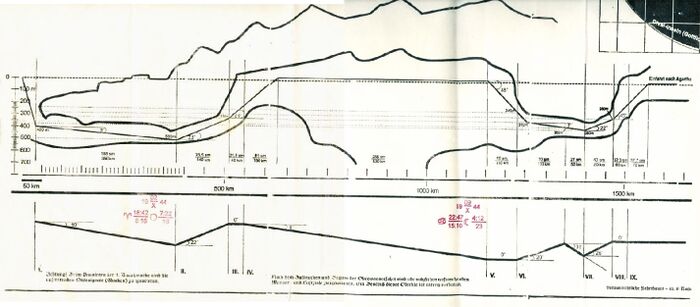 In view of the known technical information on the u-boat XXI, this route could seem possible for their captains. In addition, in the proposed scenario, the underground part carried out in the open air, over nearly 500 kilometers, allows the batteries to recharge before diving again. This helps to make the scenario "acceptable". They knew, of course, that they would run great risks beyond 280 meters depth (many sites indicate that the u-boats could dive deeper).