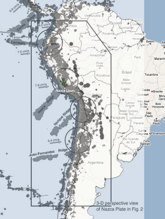 fig2. Répartition et magnitude des seismes les plus destructeurs au pérou (X sur Nazca)