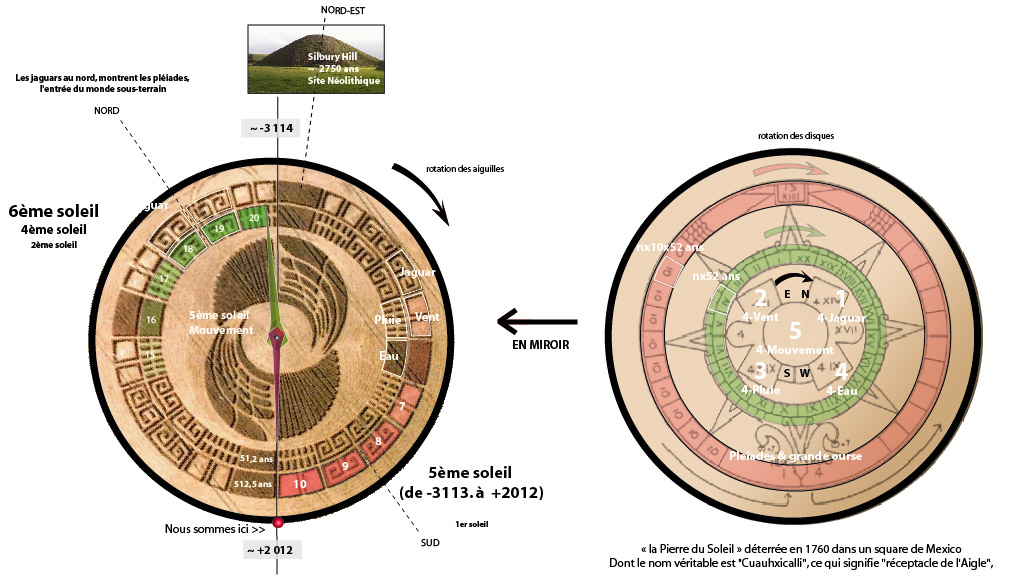Dans ce cas, la logique semble respectée. En effet, les aiguilles de l'horloge sont en opposition de phase. Et si l'une des aiguilles semble être revenue presque en position initiale (marquée par Silbury Hill et le début de la 4ème ère), l'autre est à mi course. Ce qui signifie que ce serait l'aiguille du compte le plus long, du calendrier Ku Tun, (en rouge sur le schéma).