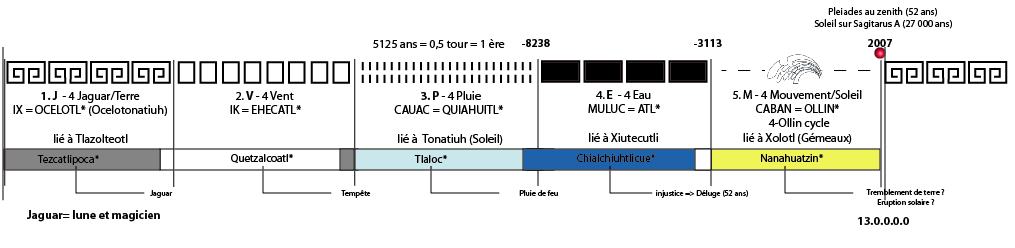 De façon pratique, ces 5 ères de durée égale font 5200 ans environ et réalisent un cycle total de 26 000 ans, correspondant à une révolution complète de l'axe de precession de la terre. C'est à dire que tous les 26 000 ans l'axe de rotation de la terre pointe dans dans la même direction de l'espace (représentée aujourd'hui par l'étoile polaire). | De façon pratique, ces 5 ères de durée égale font 5200 ans environ et réalisent un cycle total de 26 000 ans, correspondant à une révolution complète de l'axe de precession de la terre. C'est à dire que tous les 26 000 ans l'axe de rotation de la terre pointe dans dans la même direction de l'espace (représentée aujourd'hui par l'étoile polaire). | ||
