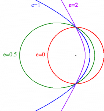 où e est l'excentricité. Elle donne ainsi une indication précise sur leur forme. Ainsi l'excentricité (<math>e</math>) est strictement définie pour toutes les orbites comme étant circulaire, elliptique, parabolique ou hyperbolique en prenant les valeurs suivantes :