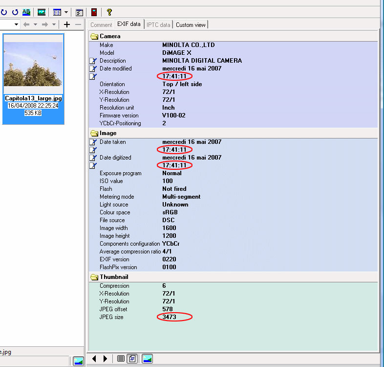 C'est la première question qui m'est venu à l'esprit. En d'autres termes, si nous recomposons des miniatures à partir des photos dont nous disposons, arriverons nous à un résultat en octets correspondant à un "poids" d'image conforme à celui indiqué dans les données EXIF ?
