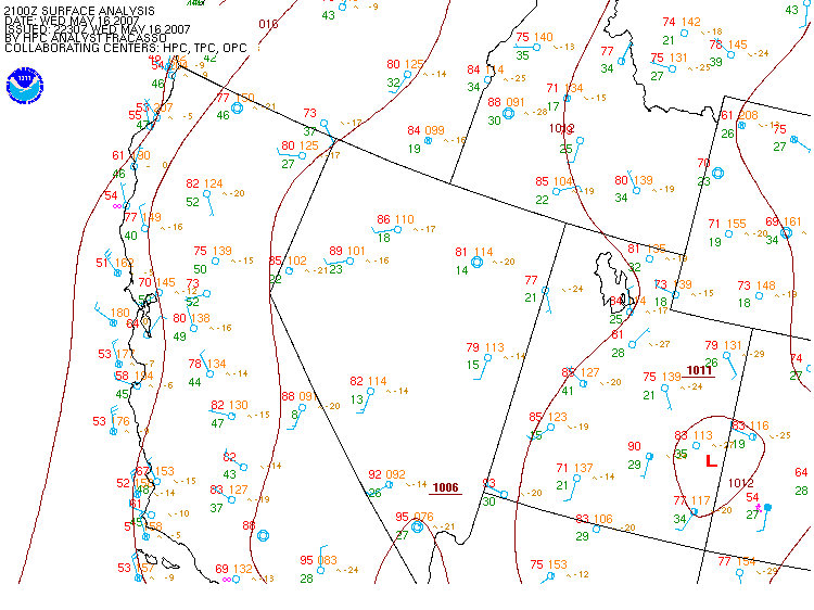 Voici les cartes météo telles proposées pour la région centre-ouest ("United States Surface Central_West Analysis"):