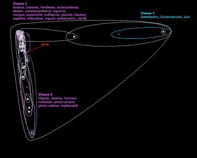 Mots clés associés: Amour propre, arrogance, audace, condescendance, contentement, crânerie, dignité, dédain, estime, gloire, gloriole, hardiesse, hauteur, honneur, impétuosité, infatuation, joie, morgue, noblesse, orgueil, outrecuidance, présomption, roguerie, réserve, satisfaction, suffisance, superbe, supériorité, vanité.... Méthode K-means effectuée sur 3 classes principales. La position de "l'épicentre" du mot fierté est donnée en rouge. Le mot "joie" tout à droite, se sent un peu seul. Pas de quoi être fier...