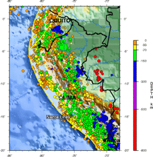 Seisms in Peru regularly destroy constructions and are making thousands of victims. At the the vertical of Nazca, the depth of the Wadati-Benioff zone is approximatively of 70km.